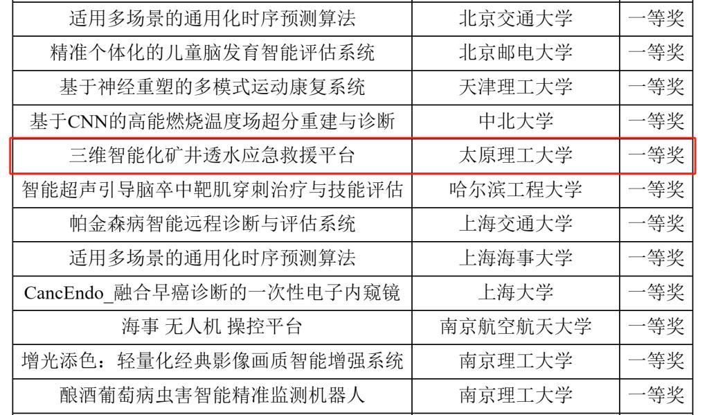9月22日至9月24日,“华为杯”第五届中国研究生人工智能创新大赛全国总决赛在山西太原举行,经过初赛、决赛的激烈角逐,bat365官网研究生郁静静、杨天艺、朱登奎、胡嘉奇的参赛项目《三维智能化矿井透水应急救援平台》获得全国一等奖,bat365官网谢彪、张兴华两名教师荣获优秀指导教师奖。这是我校首次在研究生人工智能创新大赛获得全国一等奖,实现了此项赛事上的新突破。