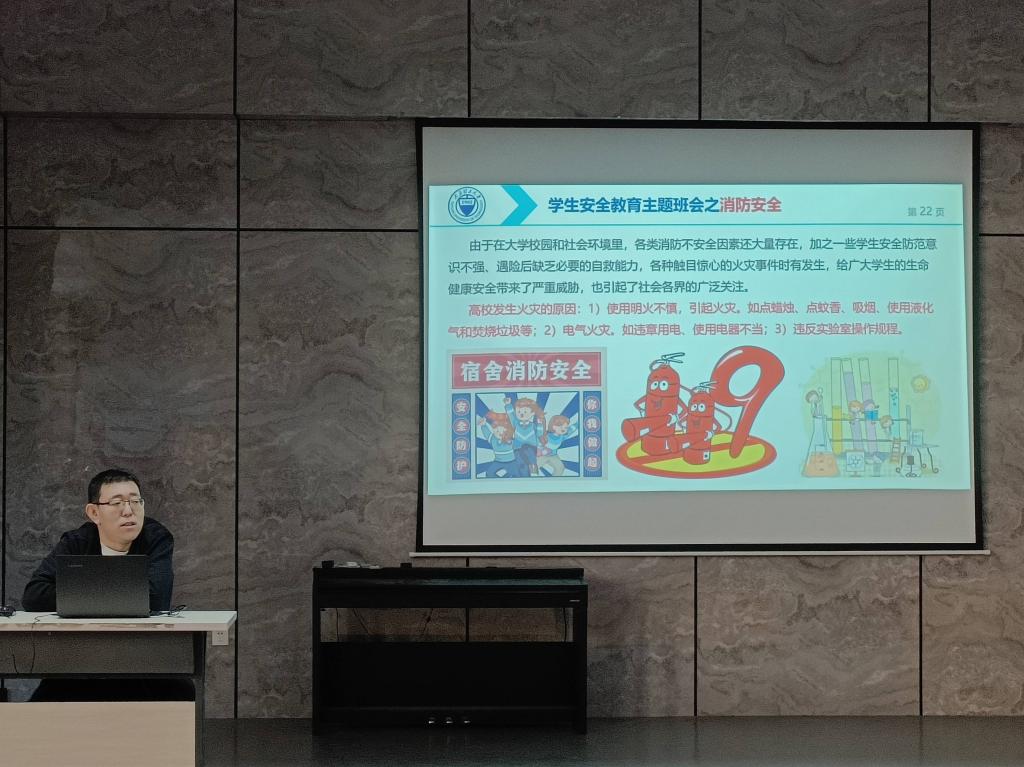 辅导员孟子超从网络安全、财产安全、交通安全、消防安全、日常生活及防溺水教育这六个模块展开此次安全教育主题班会。孟子超向全体同学提出如下要求:一是从思想上提高警惕,防范网络安全风险,谨防电信网络诈骗,携手共建网络安全环境;二是时刻警惕盗窃、校园贷等危害财产安全的行为,妥善保管自己的个人物品,守好自己的钱袋子;三是提高交通安全防范意识,在校园内过马路时应注意观察来车,不要做“低头族”;四是严格遵守学生宿舍行为规范,不在宿舍内使用明火,严禁私拉电线、使用违规电器等行为,杜绝火灾隐患;五是注意日常生活中的安全问题,如进行体育运动前应充分拉伸、在宿舍教室中应避免追逐打闹、避免招猫逗狗等;六是牢记防溺水措施“六不准”,避免发生溺水事故。
