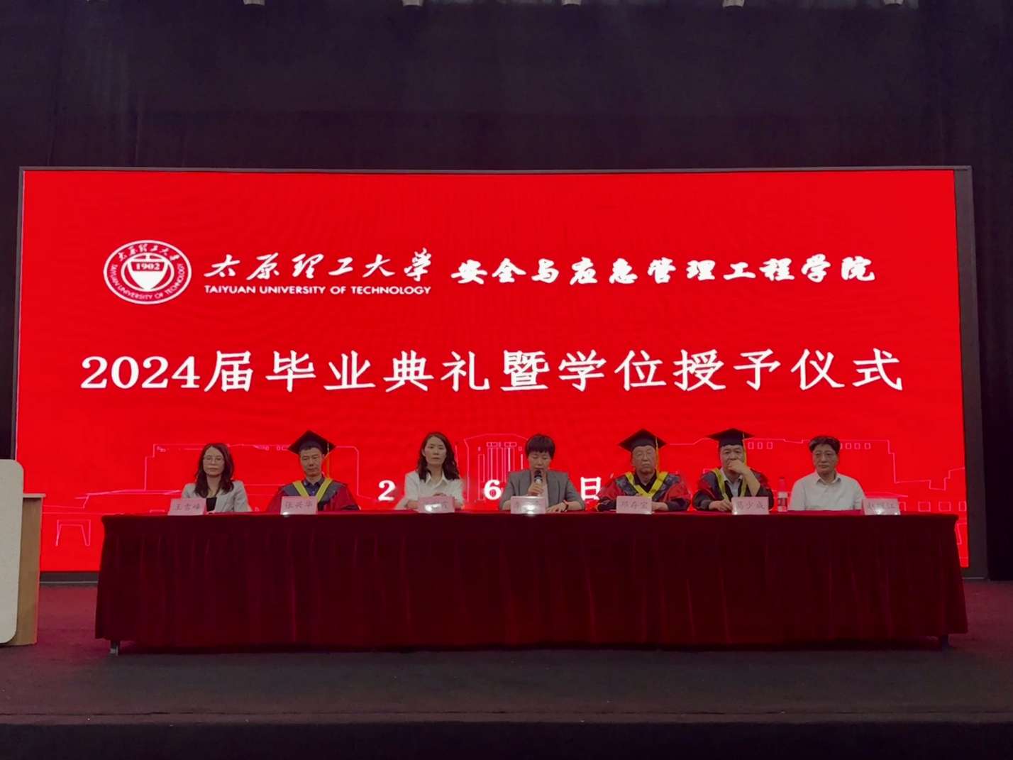 6月12日,bat365官方网站2024年毕业典礼暨学位授予仪式在明向校区轻纺工程学院表演厅隆重举行。bat365官方网站党委书记李平、院长邓存宝,安全工程技术与装备研究院院长张兴华,bat365官方网站党委副书记侯彩霞、副院长葛少成、副院长王雪峰出席本次典礼。部分教师代表、全体辅导员、研究生班主任和毕业生家长代表现场观礼。仪式由李平主持。